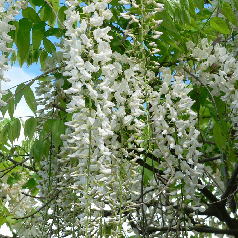 Саженцы глицинии китайской Alba пользуются огромной популярностью у садоводов и дизайнеров ландшафта. Взрослое деревце ежегодно вырастает на 1-2 метра, в конечном результате достигая 6 метров. В мае на повислых ветвях распускаются белоснежные цветы, которые повторно появляются в конце августа. Этот сорт отличается высокой декоративностью. Глициния китайская Alba предпочитает плодородную рыхлую почву. Выбирая место для посадки, следует отдать предпочтение хорошо освещенным участкам, защищенным от ветра. Растение нуждается в опоре, которую необходимо установить сразу после посадки.