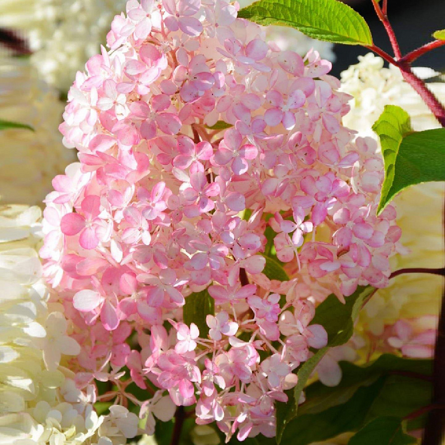 Саженцы гортензии метельчатой Diamantino (Диамантино) отличаются продолжительным цветением – с июня по сентябрь. Этот крупномер может вырасти до 120 сантиметров. Таких же размеров достигает и объем кроны. Сорт имеет ряд достоинств: