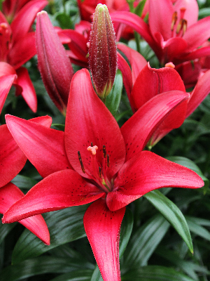 Лилия Ла-гибрид Блэкберн - это великолепное растение с малиново-красными цветками, украшенными темным крапом у центра. Ее глянцевый вид и контраст с темно-зелеными широкими листьями делают ее настоящим украшением любого сада. Этот сорт лилии достигает высоты до 110 см и цветет в июле, радуя глаз своими крупными цветками диаметром до 17 см.