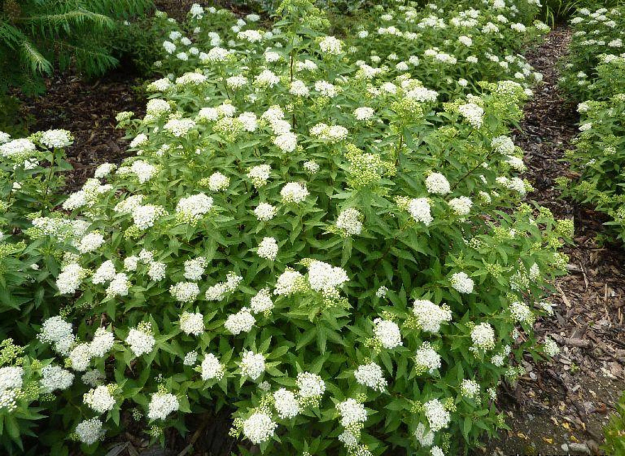 Неприхотливые саженцы спиреи Альбифлора будут отлично смотреться в сочетании с хвойными кустарниками и спиреями другой расцветки.